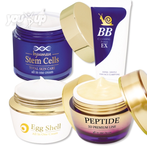 | 内容量 | [ヒト幹細胞培養オールインワンクリーム]50ml [卵殻膜パワーブライトオールインワンクリーム]50ml [極上かたつむりBB洗顔フォーム(EX)]100ml [レーザーペプチドオールインワンクリーム]50ml |