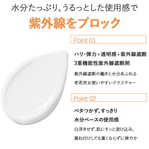 SPF50+/PA++++の紫外線カットの働きを持ちながらベタつかないジェルタイプの日焼け止めです。