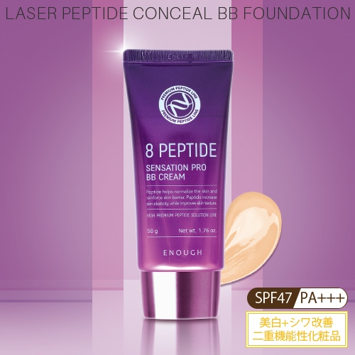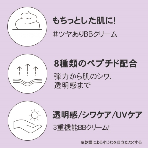 潤いを与えるコラーゲン、年齢による悩みに働くナイアシンアミドとペプチド、鎮静ケアのCICA成分配合で、スキンケア発想のBBファンデとなっており、年齢による肌の悩みを全てカバーしてくれます。