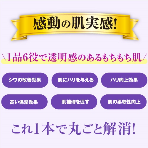 吸収が難しい水と油の相反する成分を肌に吸収可能な球体状に閉じ込め、根深い「シワ根っこ」まで効果的にアプローチします。更に、天然保湿因子NMF「ポリグルタミン酸(アミノ酸)」が新たに配合され、潤いをしっかりと保持します。