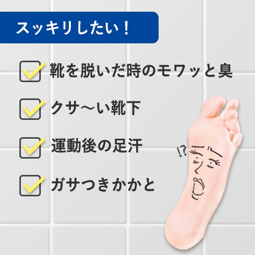 靴の中が汗で蒸れて不快に感じている方や、靴を脱ぐ場面でニオイが気になってしまう方におすすめの商品です。