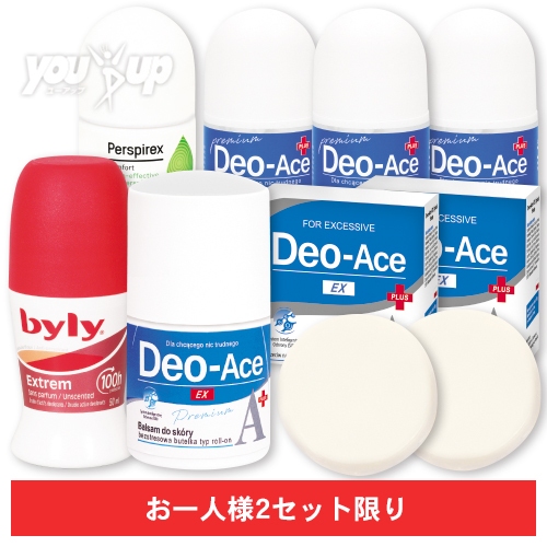 | 内容量 | [ピタデオーレEX]50ml [デオエースEX(プラス)]40ml [デオエースEX(プラス) 20ml]20ml×3 [デオエースソープEX(プラス)]100g×2 [デトランスα敏感肌用(アルコールフリー)]20ml |